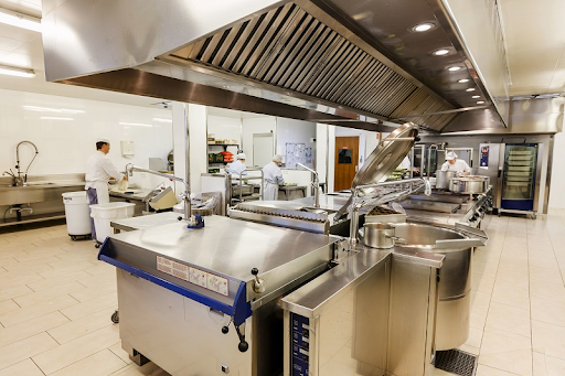 Està distribuïda en tres zones diferenciades (la freda, la calenta i la de rentat) per poder evitar la contaminació creuada dels aliments crus o cuinats i per facilitar els circuits tant de mercaderies (matèries primeres) com de les persones.